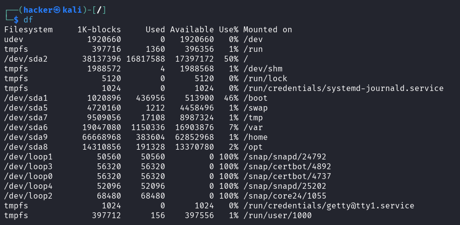 The df (disk free) command shows filesystem disk space usage: