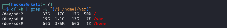 df -h | grep -E "(/$|/home|/var)"\