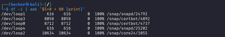 Explanation β df -i | awk '$5+0 > 80 {print}'