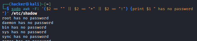 sudo awk -F: '$2==""' /etc/shadow |